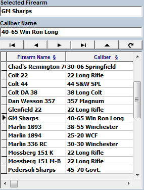 A particular Firearm may be selected here and at various other places in the tabbed pages. This Firearm Selection list is always visible and accessible during any phase of the program. Once a Firearm is selected, all visible data on any of the tabbed pages is keyed to that particular Firearm.