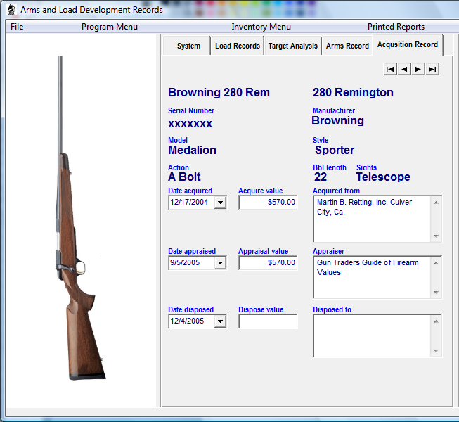 As in the Arms Record page the Firearm may be selected with the Database NavigatorBar and only the acquisition and disposition information may be edited from this page.