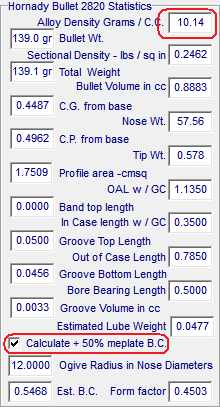 Un-checking the "Calculate + 50% meplate B.C." box will set the Coefficient of Form factor to 1 and the ballistic coefficient will then be estimated as equal the Sectional Density of the bullet.