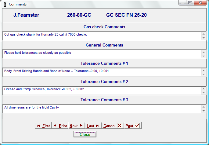 Any comments written into these fields will be stored and displayed on the bullet sketch when it is drawn.