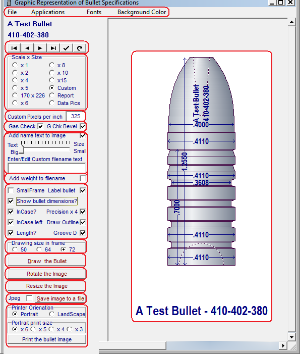 Selecting "Custom" will allow editing of the "Custom Pixels per inch" field where the number of pixels per inch may be edited. Entering a value of 1000 will draw the image to a scale of 1000 pixels per actual inch of the bullet.