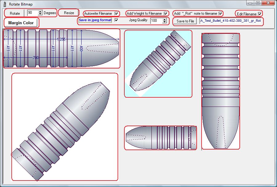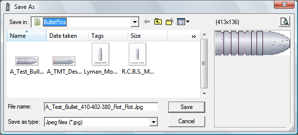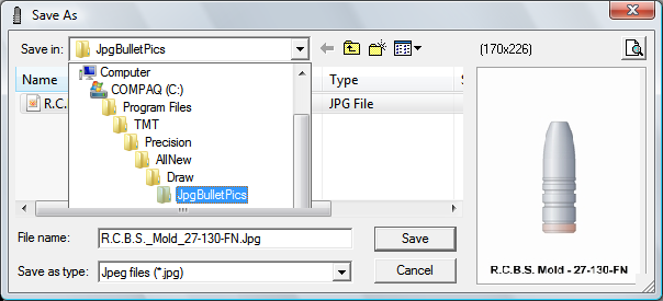 If the "Save as Jpg" checkbox is checked, the default location is a folder located at C:\Program files(x86)\TMT\Precision\AllNew\Draw\JpgBulletPics.
