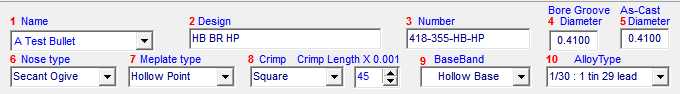 3. The Number field is used to record the index or catalog number and should be unique to the bullet, suggesting the dimensions, design and weight of the bullet. A 3 part number works well. The first sector indicating the as-cast diameter, next, the diameter of the bullet nose (if a bore riding bullet) and last, the weight of the bullet cast from the appropriate alloy.