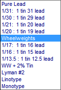 Select the appropriate bullet alloy from the drop down list. The specific gravity of the selected alloy will be displayed in the Calculated Dimensions Box in the Alloy Density Grams/c.c. Field. The Grams/c.c. field may be edited without changing the value in the Alloy Type Field.