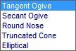 The desired nose configuration is selected from a drop-down list. When entering values into a new record it is best to select the "Tangent Ogive" for the initial calculations. If another ogive configuration is desired it can be selected after exiting the #12 In-Case data field.