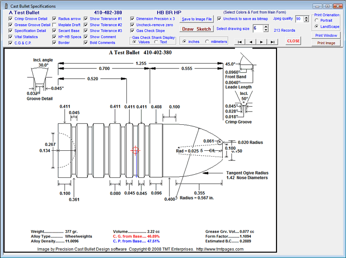 A "Gas Check Shank Display" radio button selection of Values will display the dimensions of the gas check shank. The Text selection will display instructions to cut the shank to fit the appropriate gas check selected from the Gas Check Database.