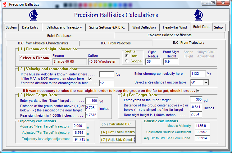 Finally, click button 6 to open the data entry sheet then enter the atmospheric and elevation values of your range into the adjustment calculator. Return to the "BC from a Trajectory" page and click button #7 to calculate the Stantard Sea Level BC for the bullet. Enter this value as the Tested and Working BC for your bullet.