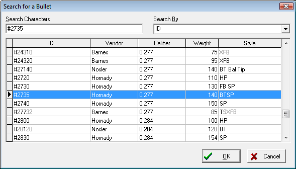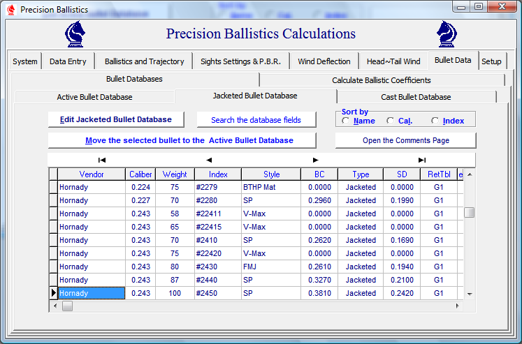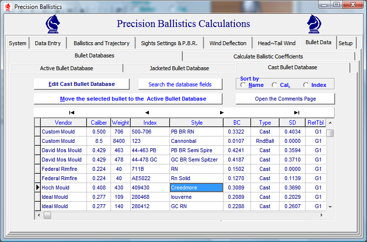 Bullet information may be entered into the active list from either the Edit Bullets Module or from the Ballistics Calculation Tabbed Pages, after a suitable ballistic coefficient has been Calculated or Estimated
