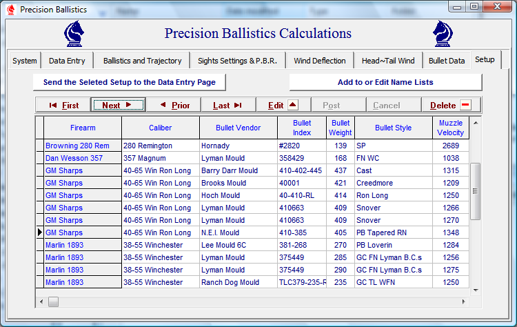 The saved and stored individual Setup Data records may be selected and sent to the Data Entry page from this database grid.