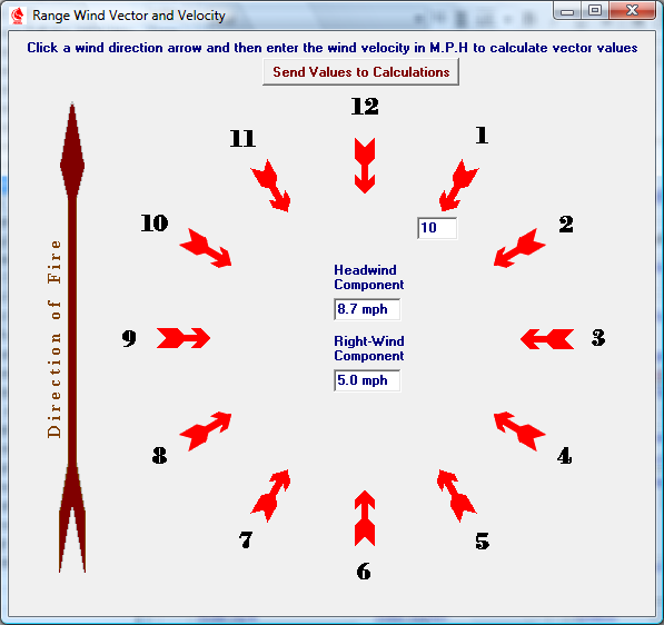 Click on a wind direction arrow and enter the velocity of the wind coming from that direction. The software will then calculate the Headwind/Tailwind vector and the Crosswind vector that will act upon the Vertical and Horizontal bullet displacement for that particular velocity and direction.